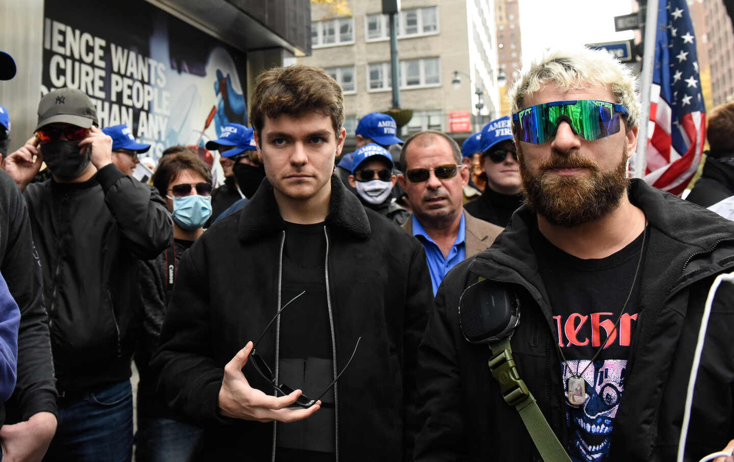 Nickas Fuentesas su tiesioginės transliacijos transliuotoju ir sausio 6 d. sukilimo šalininku Baked Alaska 2021 m. lapkričio 13 d. Niujorke prieš vakcinaciją su kraštutinių dešiniųjų grupės „America First“ nariais priešais Pfizer būstinę.