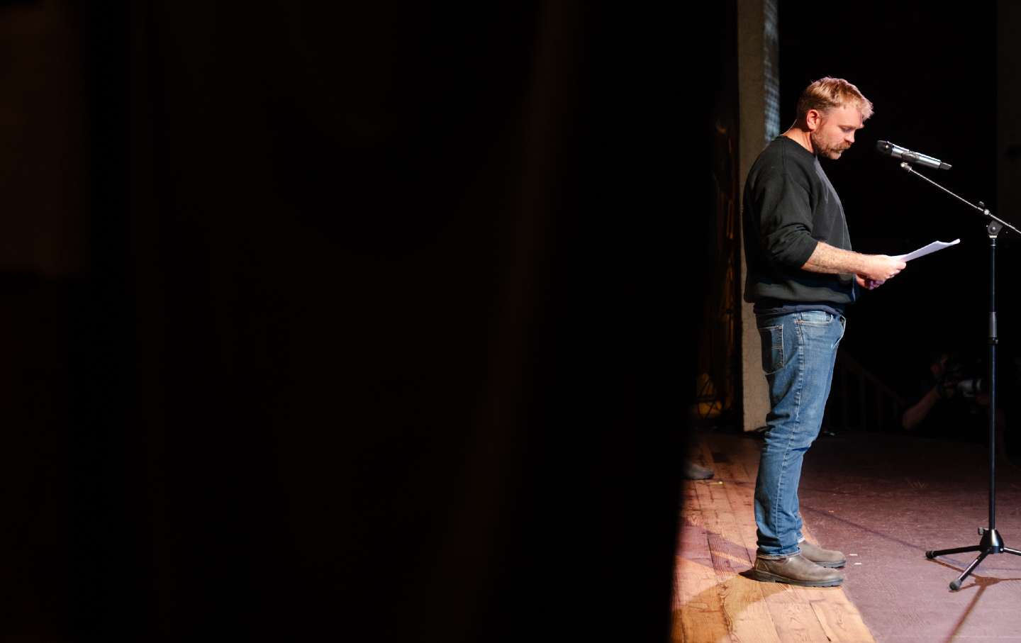 Demokratų kandidatas į Senatą Grahamas Platneris kalba Rotušėje Ogunquit mieste, Meine.