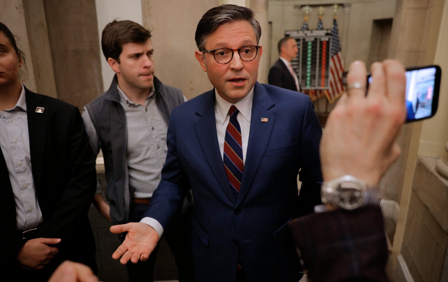 Atstovų rūmų pirmininkas Mike'as Johnsonas kalbasi 28-ąją federalinės vyriausybės uždarymo dieną Kapitolijuje.